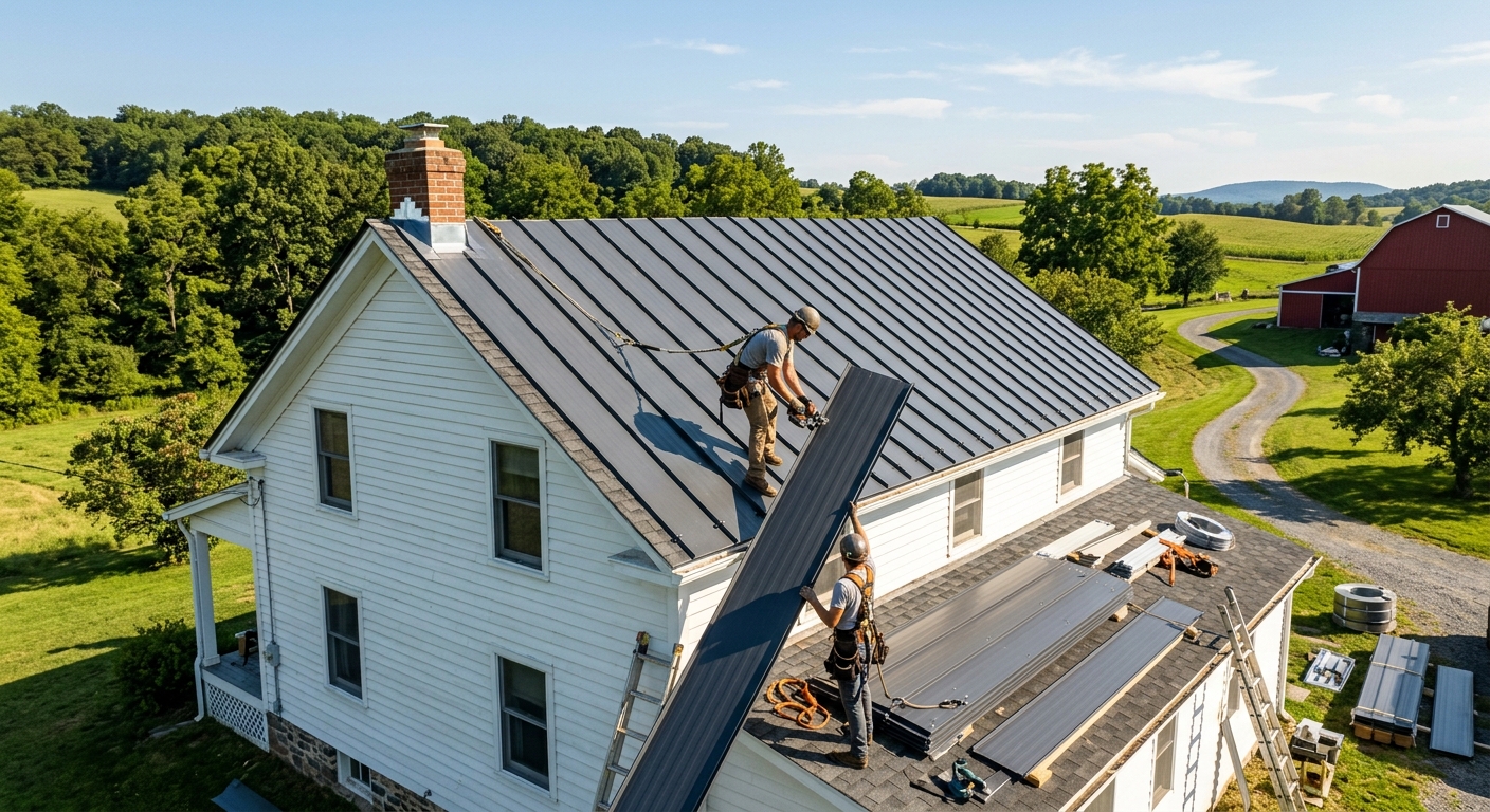 Standing seam and corrugated metal roofing systems installed by certified contractors in Columbia, PA. Lifespan 40-70 years, energy-efficient, low maintenance.