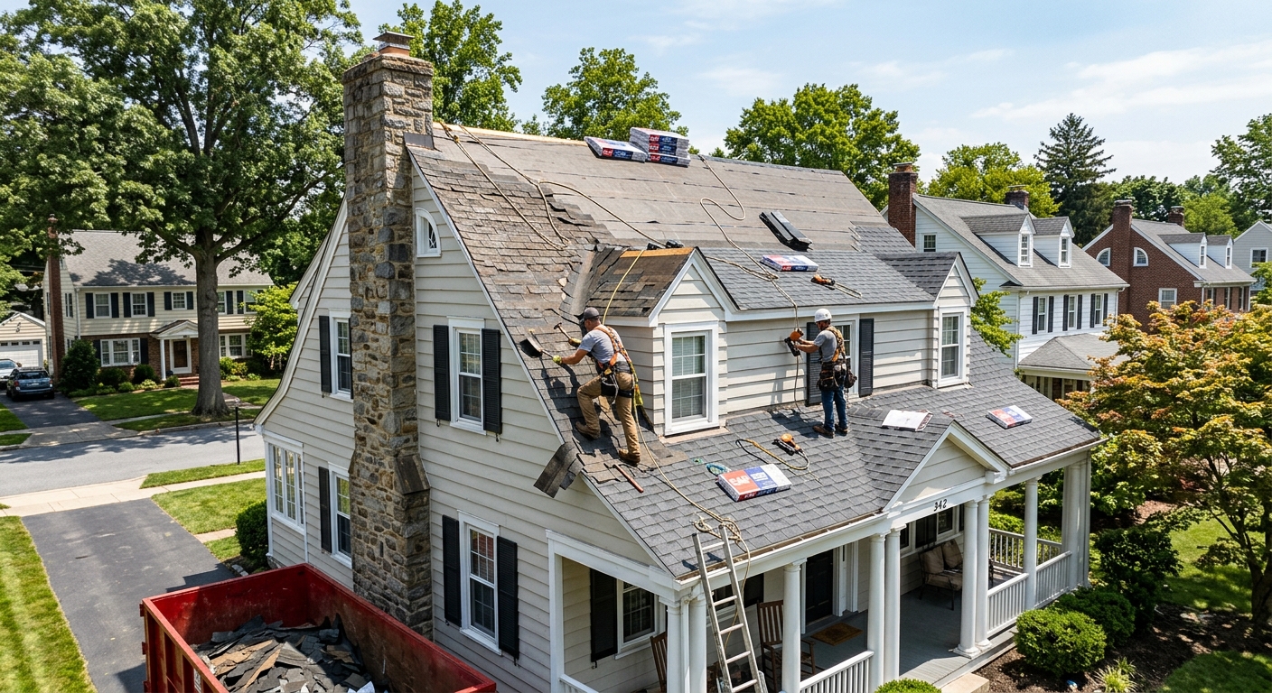 Most standard residential roof replacements in Falls, PA are completed in 1-2 days. A 2,000 sq ft asphalt shingle roof typically takes 1 full day with a crew of 4-6. Larger homes, complex rooflines, or specialty materials (metal, slate) may take 2-3 days. Weather is a factor in Pennsylvania — most contractors schedule jobs with a weather window to ensure proper installation.