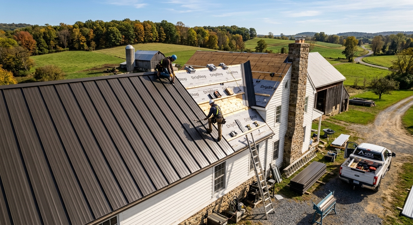 Standing seam and corrugated metal roofing systems installed by certified contractors in Monroe, PA. Lifespan 40-70 years, energy-efficient, low maintenance.