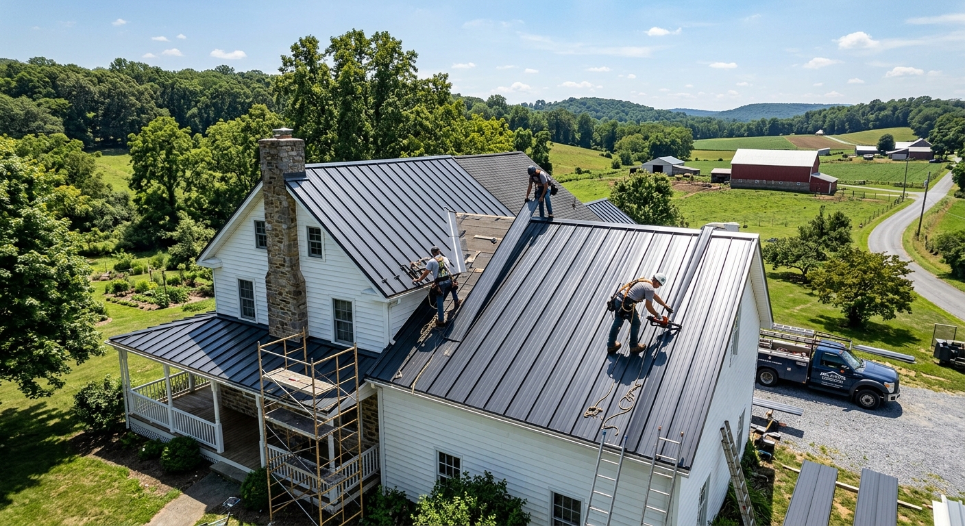 Standing seam and corrugated metal roofing systems installed by certified contractors in Mount Joy, PA. Lifespan 40-70 years, energy-efficient, low maintenance.